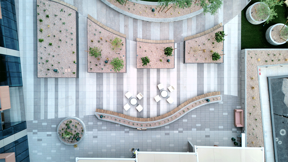 The smaller 12″x24″x2″ pavers were arranged in a soft gradient pattern, creating subtle movement and visual depth, while the larger 18″x36″x3″ pavers formed bold, solid bands of color that anchored the design. Carefully chosen shades of grey transformed the vast expanse into a series of engaging environments, from wide-open gathering spaces to quiet, intimate corners.
